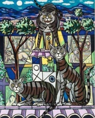 Pinturas singulares en temática y estilo son las de Rafael Zabaleta, en cuya “noche de gatos” el rico simbolismo se conjuga con la audacia compositiva. No menos misteriosa, y palpitante de velada sensualidad, es el encuentro nocturno de manolas en el óleo de Ramón Pinchot.