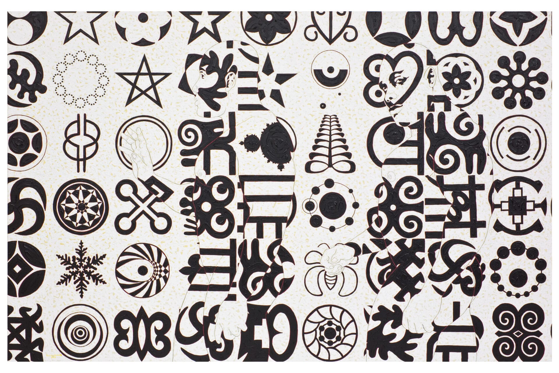 Owusu-Ankomah, nacido en Sekondi (Ghana), se dio a conocer por sus lienzos de gran formato con monumentales figuras humanas sobre un denso fondo de símbolos. Su práctica artística evolucionó a través de varias fases. Inicialmente, se inspiró en las antiguas tradiciones africanas de pintura rupestre y mascaradas, para luego despojar a sus figuras de las máscaras, convirtiéndolas en lo que la galería describe como «actores mudos que flotan en un océano de signos». Mediante la técnica del trompe l’oeil (trampantojo), el artista cubría los cuerpos esculturales de sus figuras con glifos que se mimetizaban con el fondo, creando un efecto en el que las formas se funden con su entorno simbólico.