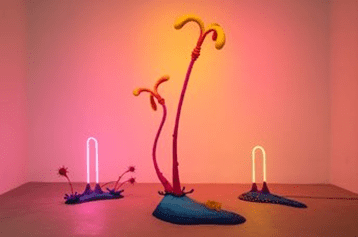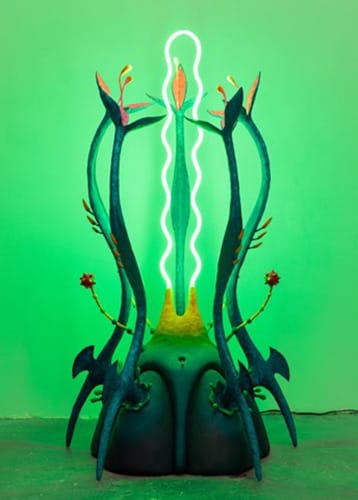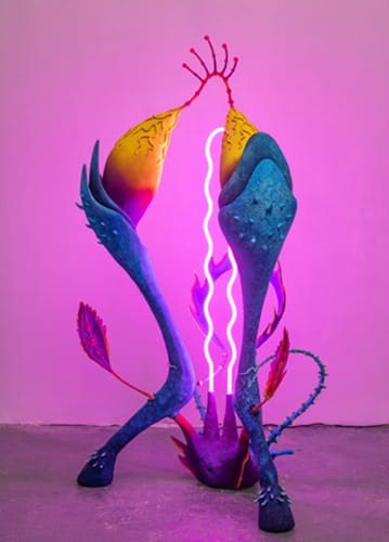 Nocturnal Moonrise desafía las nociones normativas de be- lleza. Para Chen, aquello que se llega a considerar mons- truoso guarda una belleza particular que le da poder, que ilumina su entorno. “Capturo la tensión entre algo que es deseable y a la vez repulsivo”, ha declarado. Las escultu- ras mostradas en VETA by Fer Francés constituyen un ver- dadero ejercicio de resistencia contra las normas sociales y, a su vez, animan al espectador a reevaluar los concep- tos de identidad, sexualidad y religiosidad. Las obras, realizadas en diversos materiales –fibra de vidrio, resina, metal…– y trabajadas a través de varios procesos, están autoiluminadas con neones, meticulosamente aerografiadas y ornamentadas con piercings de acero y plumas de ave. Se asemejan a elementos de plantas extrañas, criaturas de las profundidades marinas, órganos reproductores y nodos eléc- tricos.