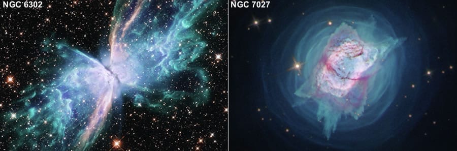 Como motores de fusión nuclear, la mayoría de las estrellas viven plácidamente desde cientos de millones hasta miles de millones de años. Pero cerca del final de sus vidas pueden convertirse en torbellinos locos, enviando lejos sus corazas y chorros de gas caliente. Los astrónomos han empleado la gama completa de capacidades de observación del Hubble para diseccionar esos fuegos artificiales locos que ocurren en dos nebulosas planetarias jóvenes cercanas. Por un lado está NGC 6303, más conocida como la Nebulosa de la Mariposa debido a su apariencia de ala. Por otro lado tenemos a NGC 7027 que se asemeja a un insecto con una concha metálica de colores brillantes.