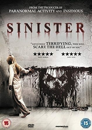 Sinister (traducción fácil: siniestro) es una película de ésas que te quitan las ganas de escribir porque está protagonizada por un escritor que le da a la bebida y se fuma algo de vez en cuando (no sé por qué pero terminas por sentirte identificado). La trama es la siguiente: nueva casa, dos hijos y una mujer y un libro sobre un asesinato real por escribir. Comienzan a aparecer cajas con material revelador sobre los crímenes y a partir de ahí… suspense y terror.