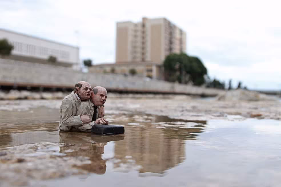 Isaac Cordal (1974) es un artista gallego que combina la escultura y la fotografía en entornos urbanos. Vive entre Bruselas y Galicia. Isaac transforma cualquier rincón de una ciudad con sus pequeñas figuras de cemento, cargadas de melancolía y crítica social. Cement Eclipses (“eclipses de cemento”, nombre artístico de Isaac Cordal) es una definición crítica de nuestro comportamiento como masa social. Sus obras de arte intentan llamar la atención sobre nuestra relación devaluada con la naturaleza a través de una mirada crítica a los efectos colaterales de nuestra evolución. Las escenas se enfocan en las tareas rutinarias del ser humano contemporáneo.