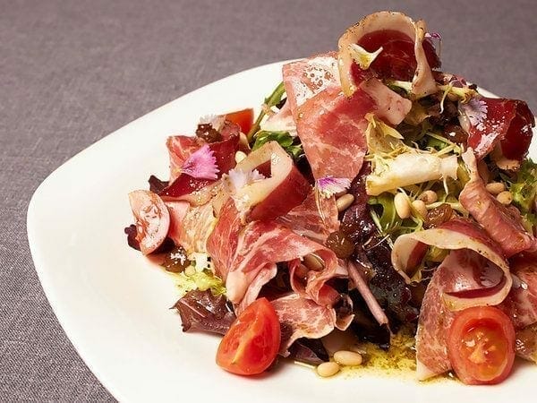 La palabra ensalada viene de la ‘herba salata’ que se consumía en el Imperio Romano a base de vegetales crudos aliñados con agua y sal. El aceite se añadió pronto, mejorando el sabor de las verduras. Finalmente, el vinagre y el limón aparecieron redondeando el plato y permitiendo una mayor durabilidad. La vinagreta había sido inventada. Este verano, Montes de Galicia, representantes de la #dietaatlántica, presentan su ensalada de Jamón de pato, ibérico, pasas y piñones con cilantro 15,90 €