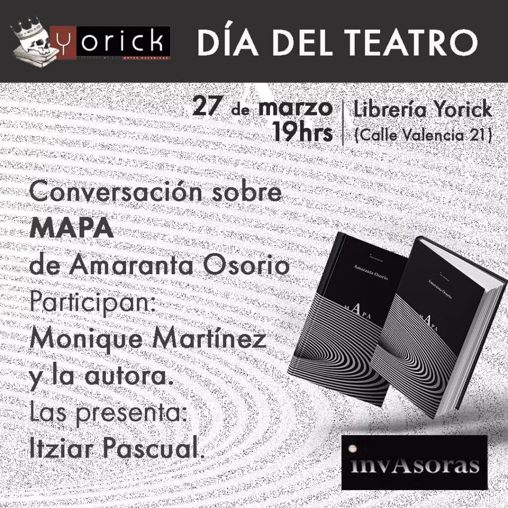 El día 27 de marzo a las 19h. en la Librería Yorick de Madrid (librería dedicada a las Artes Escénicas), con motivo del Día Mundial del Teatro, va a tener lugar un encuentro con Amaranta Osorio alrededor de su obra Mapa, escrita gracias a la beca del Sistema Nacional de Creadores del FONCA (Sistema de apoyos a la creación y a proyectos culturales de México). El acto contará con la presencia de Monique Martinez, Catedrática en la Universidad de Toulouse, especialista en teatro, cine y literatura en lengua española, quien ha realizado una gran labor de difusión del teatro contemporáneo en Francia con puestas en escena, publicaciones de textos y ensayos, y programas de investigación; además, ha escrito el prólogo de la publicación de Mapa. Como anfitriona del acto estará una fiel colaboradora de la autora, Itziar Pascual, dramaturga, investigadora, profesora y periodista, que ha obtenido distintos galardones con sus obras, como el Premio Nacional de Artes Escénicas para la Infancia y la Juventud 2019, el Premio ASSITEJ España, o el Premio SGAE de Teatro Infantil, entre otros. Junto a Amaranta Osorio ha escrito cuatro obras que se han estrenado y han ganado premios.