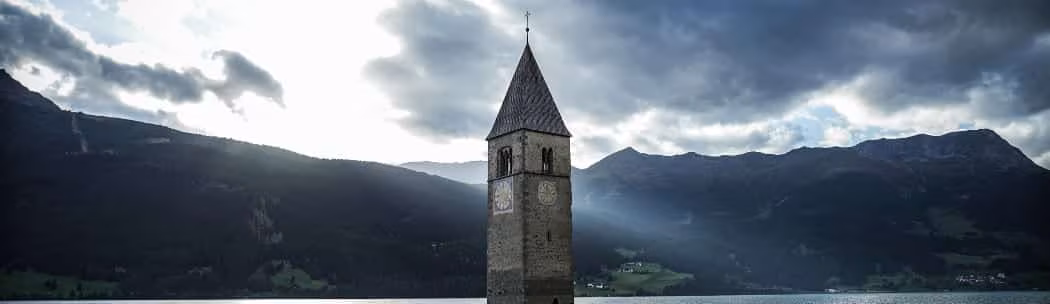 La historia cuenta que a mitad del siglo pasado, este pueblo en la ladera alpina desapareció bajo las aguas, ya que se decidió inundarlo para la creación de una represa en la zona que unificaria los lagos de Resia y Curon.